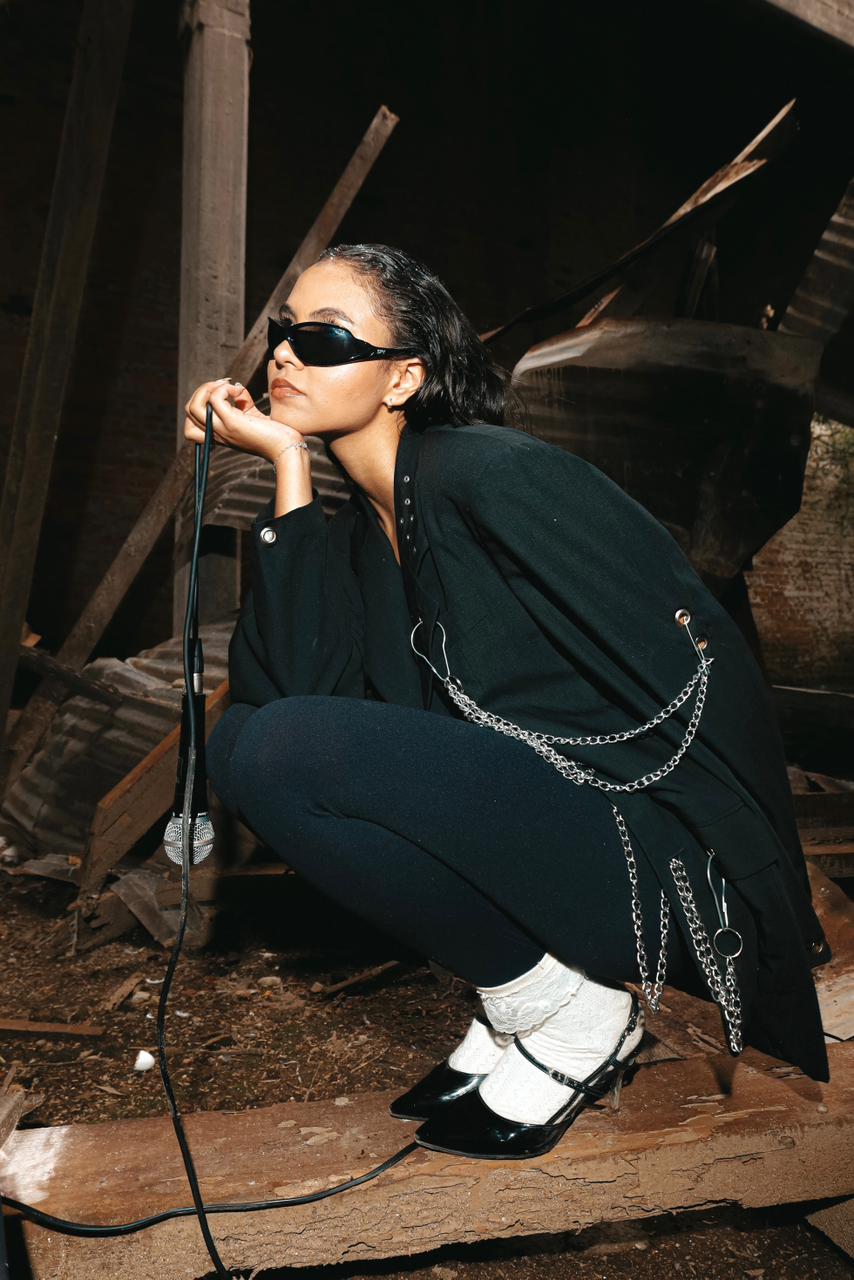 Confeccionado em alfaiataria estruturada, o modelo apresenta caimento amplo, ombros marcados, forro e bolsos internos, criando uma silhueta poderosa e moderna. A peça recebe aplicações de ilhoses metálicos e correntes removíveis, que atravessam a construção tradicional do blazer e introduzem uma estética industrial, como assinatura própria de marca. O resultado é um equilíbrio entre elegância e rebeldia, pensado para composições que transitam entre o urbano, o noturno e o experimental.