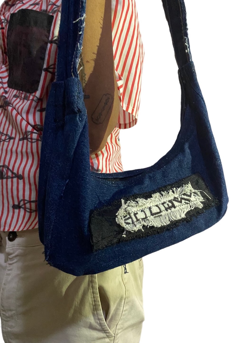 Esta bolsa foi criada a partir da reutilização de resíduos jeans. Possui um bolso externo e uma grande resistência.