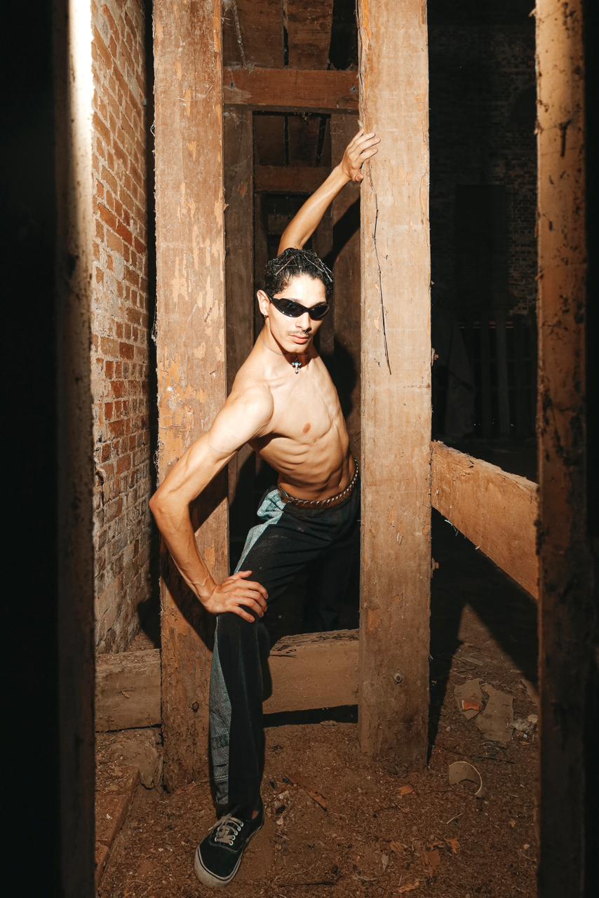 Calça de alfaiataria preta reinterpretada através do upcycling, combinando estrutura clássica com intervenções em denim cinza com estampa leopardo nas laterais. O contraste e a união entre a alfaiataria e o jeans cria uma silhueta contemporânea e autoral, rompendo com padrôes estéticos e casuais da alfaiataria, dando continuidade assim para outros universos e modos de expressão.