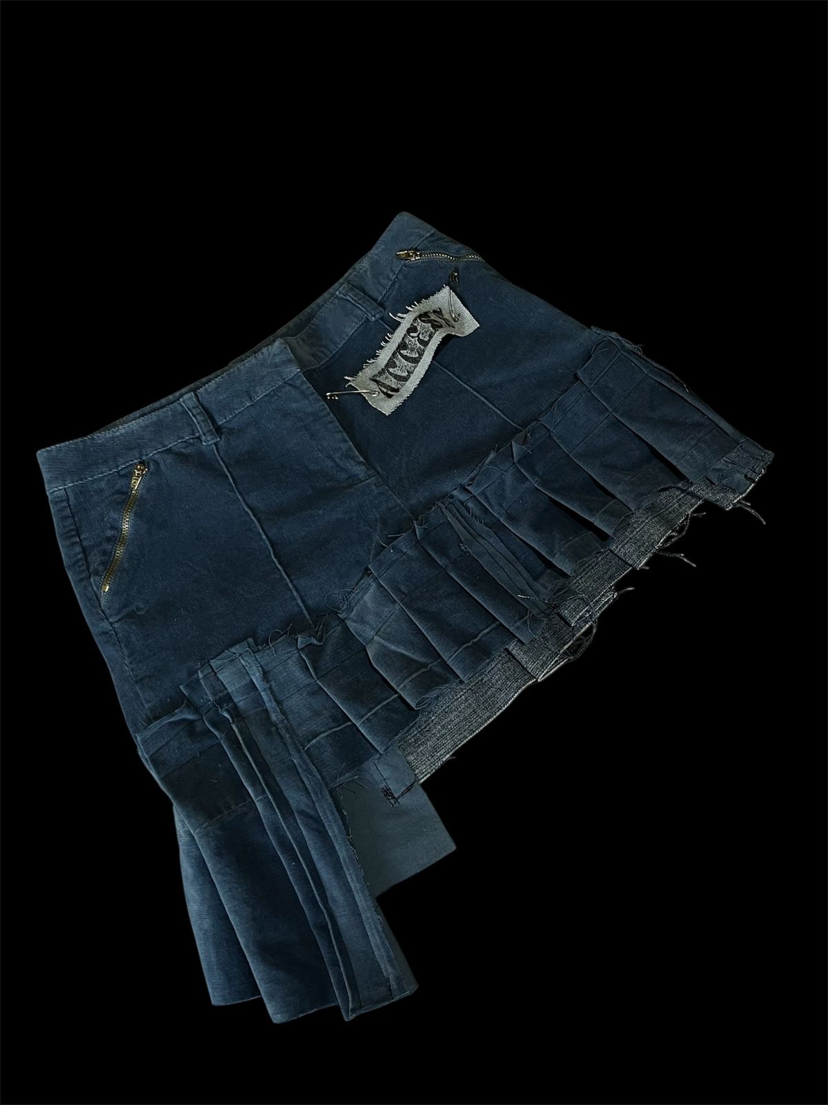 Criação autoral desenvolvida a partir do reuso têxtil em veludo cotelê azul, trazendo profundidade de textura e presença estética marcante. A peça combina diferentes recortes estruturais com barra plissada em camadas, criando volume, movimento e uma silhueta dinâmica.